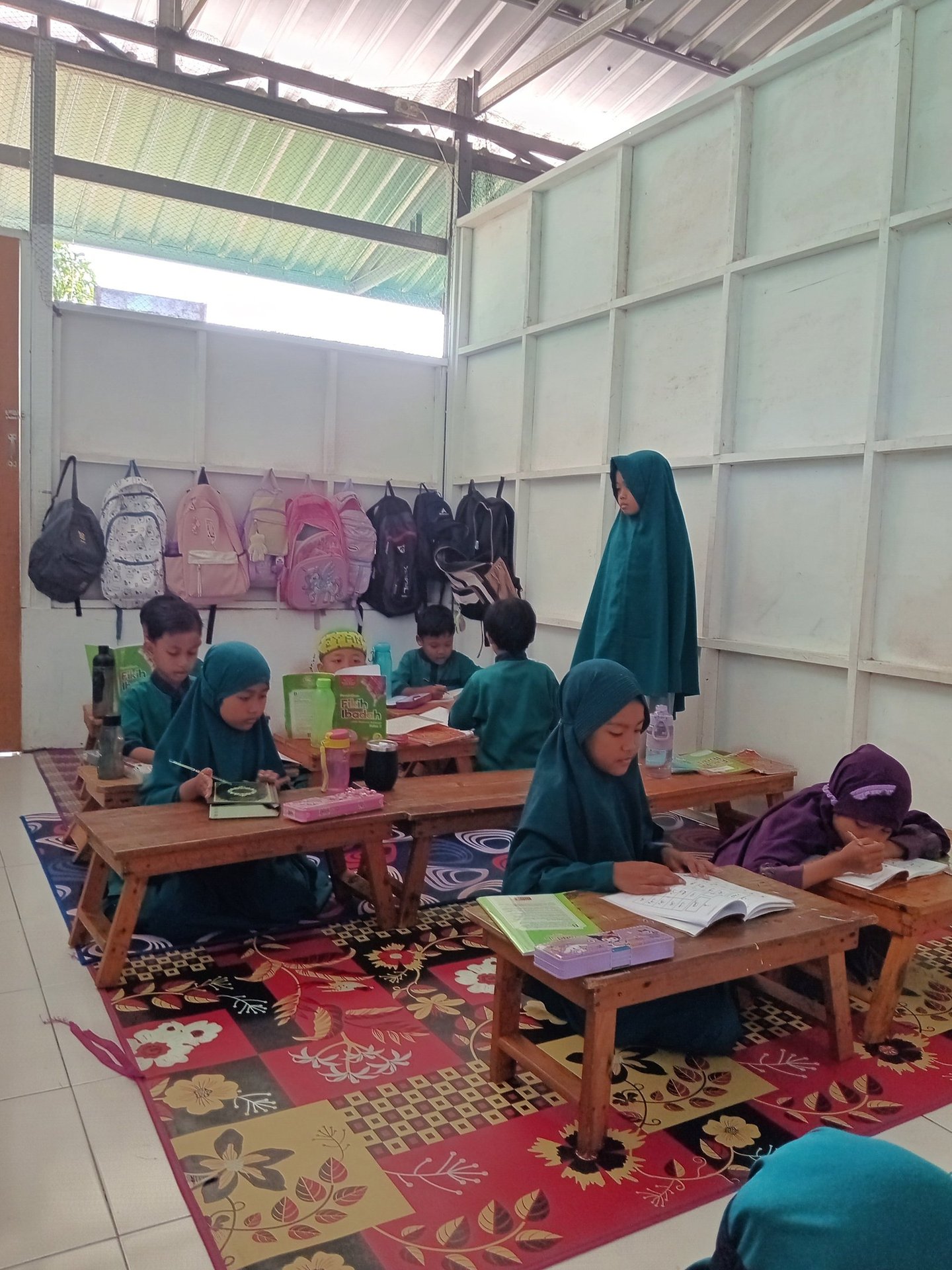 ruang kelas di atur rapi, tempat duduk berjajar rapi, tas di gantung rapi sehingga suasana belajar lebih tertib